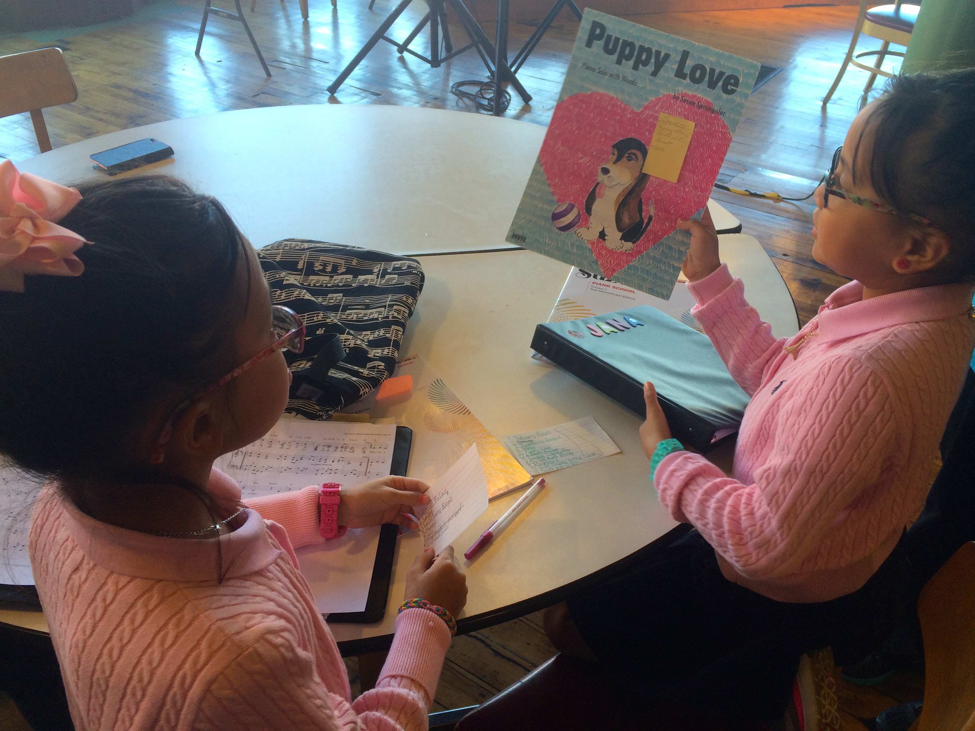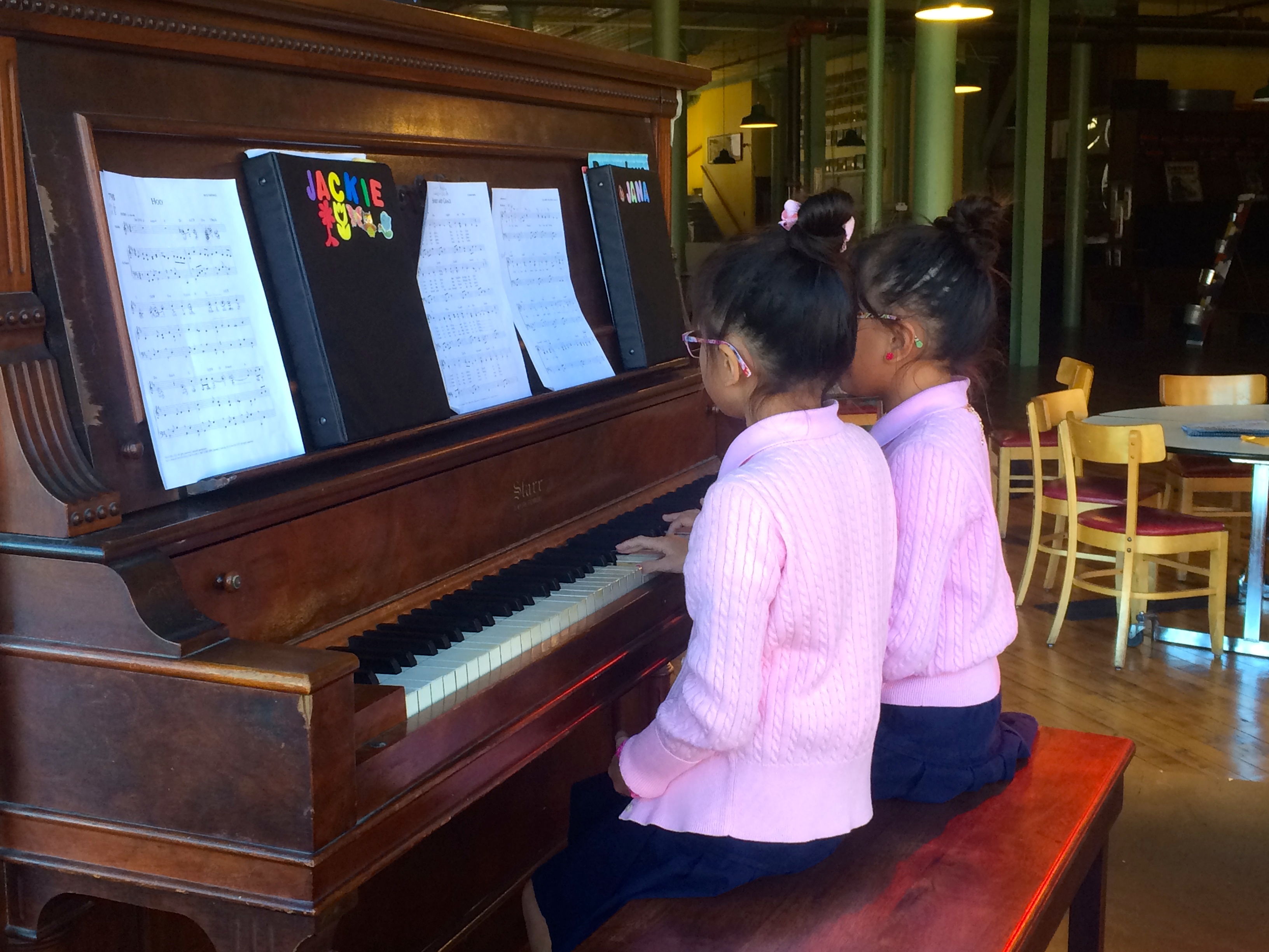 When I arrived, Eva Abbott was on the keys and nearing the end of her two hour shift at the piano. Pianists of all skill levels, totaling around 52, had been at the keys since Friday with only five minute breaks in between. Following Eva, two little girls from Seton Elementary, fourth graders and twins, were preparing to take over for their 55 minute shift, dressed in matching pink sweaters.